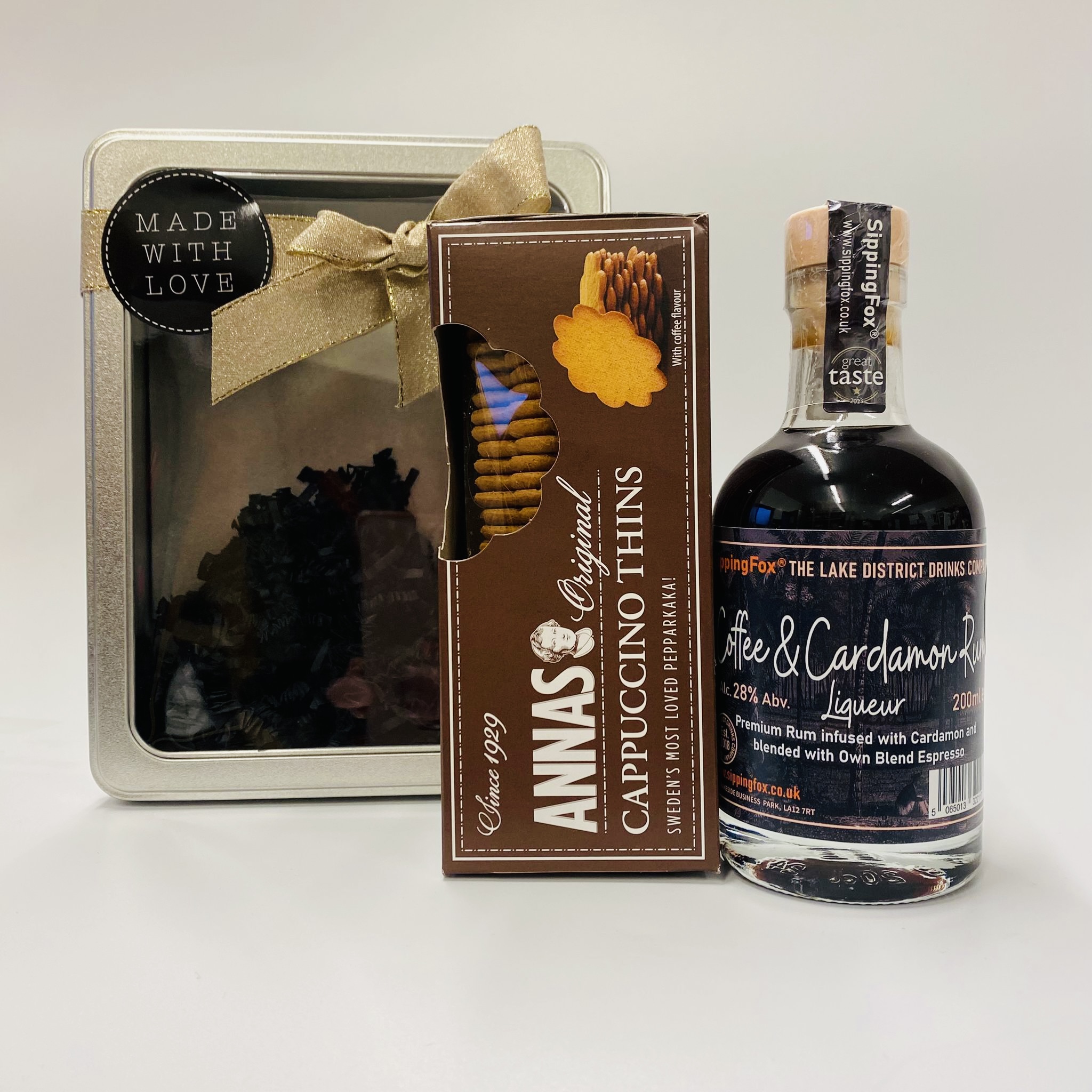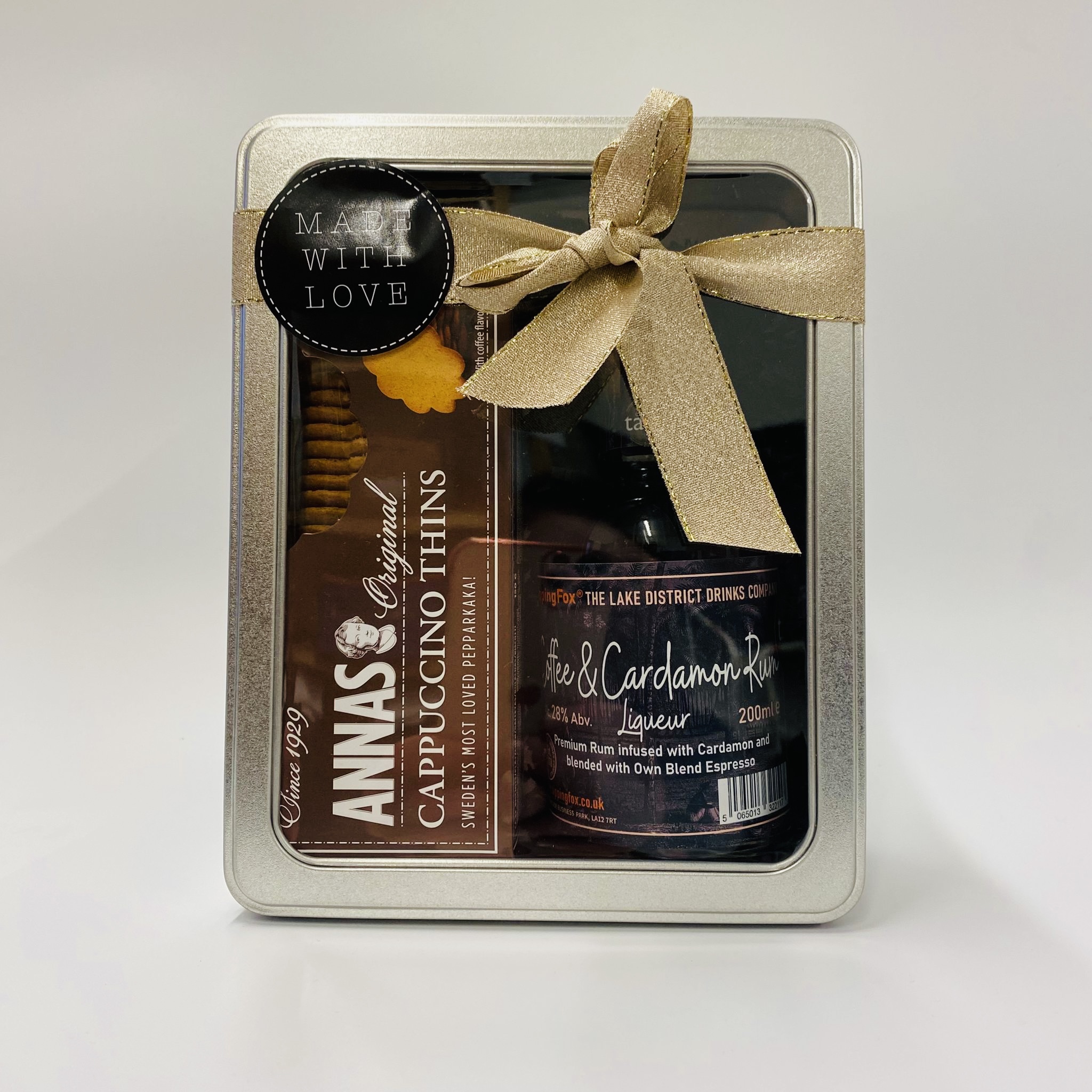 The tin contains a 200ml bottle of rum and a box of cappuccino biscuits.