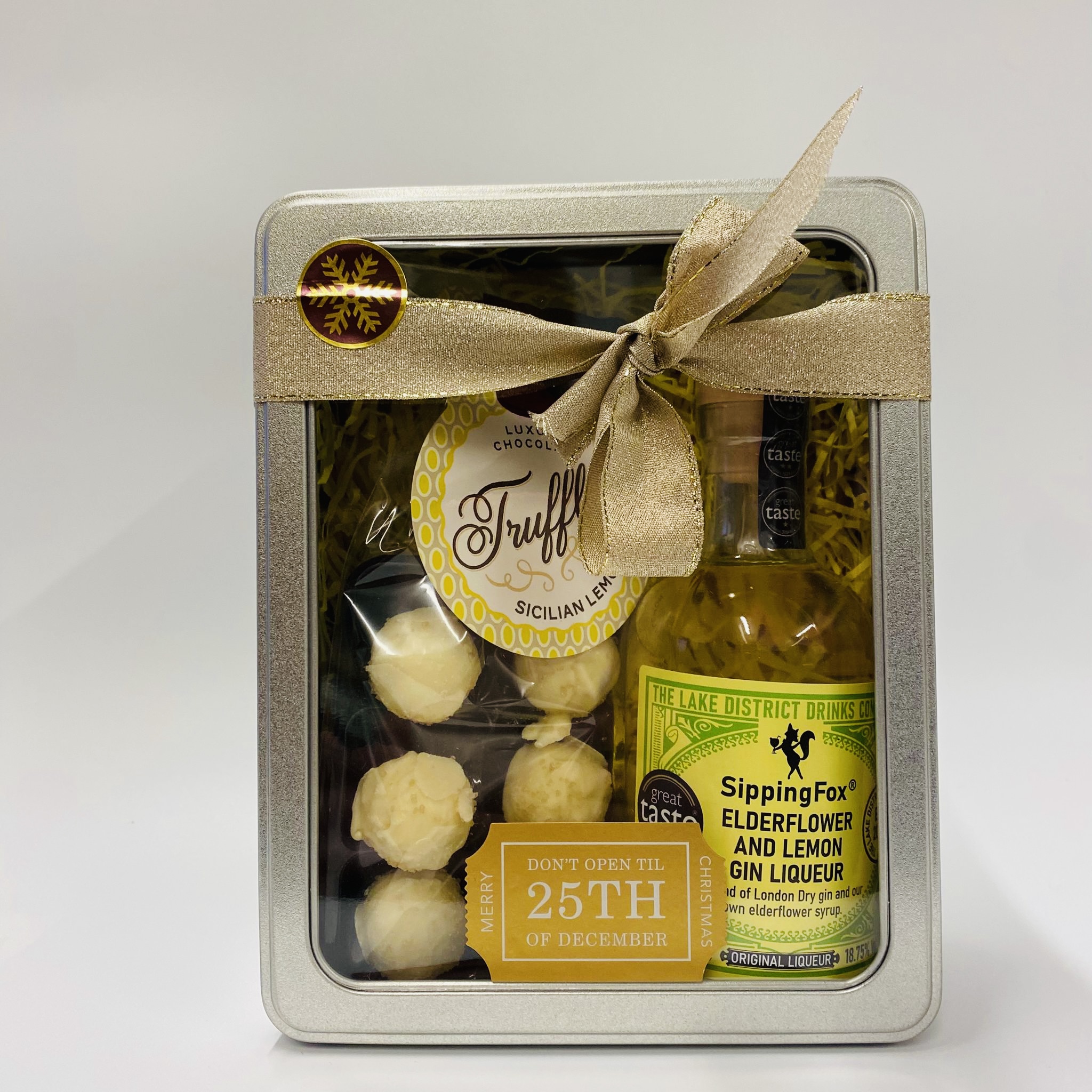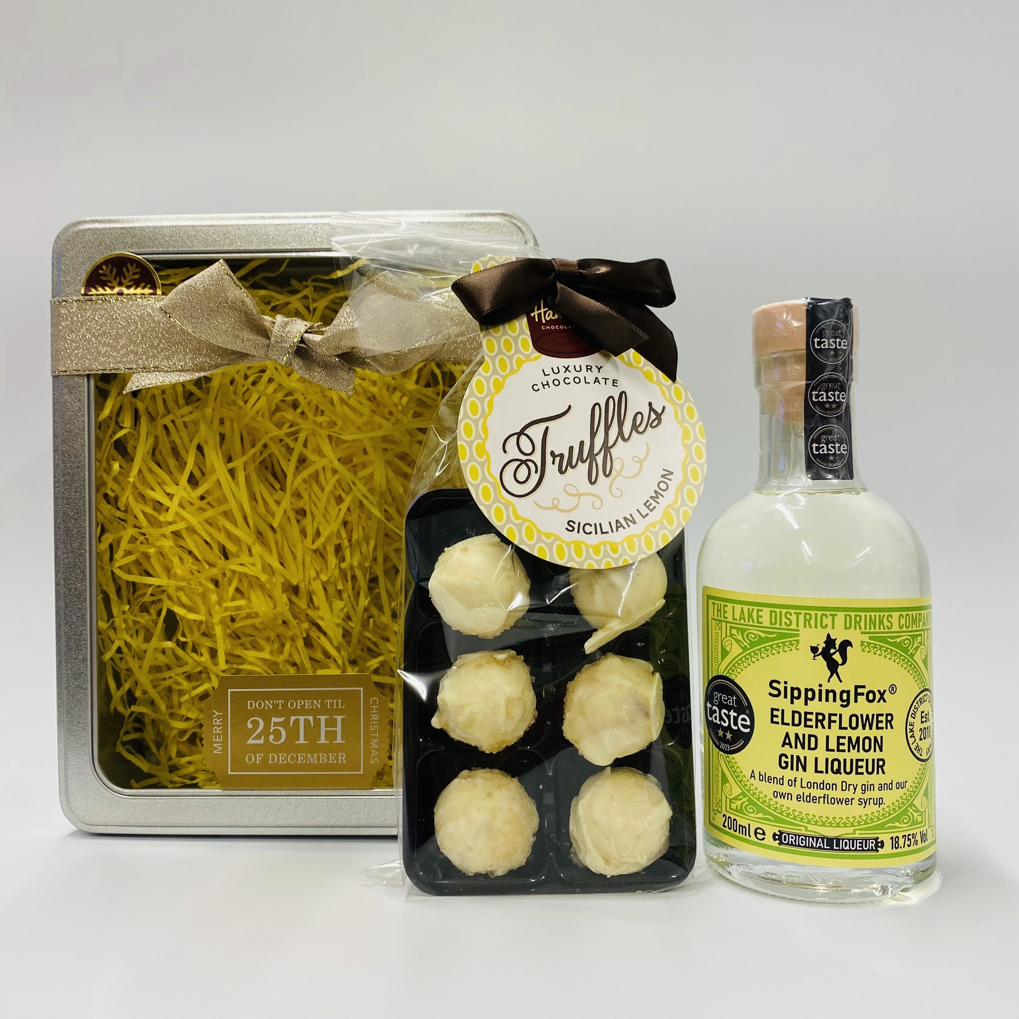 The tin contains a 200ml bottle of gin and a packet of truffles.